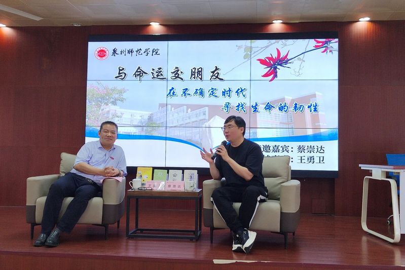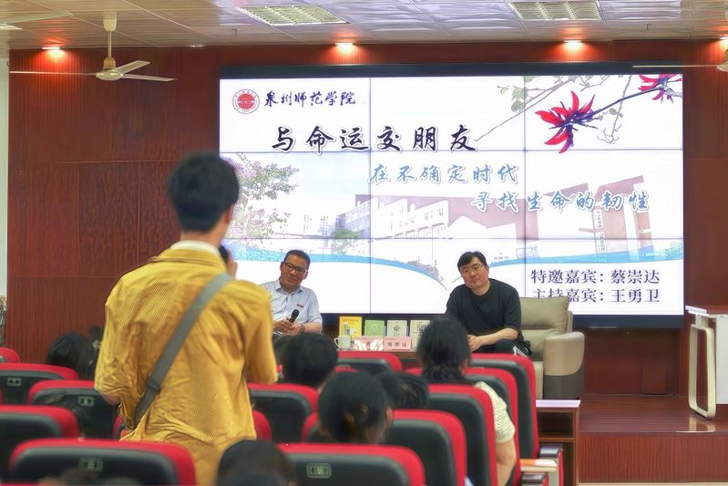 主题分享会在俊秀图书馆学术报告厅举行。文学与传播学院院长与蔡崇达以“与命运交朋友:在不确定时代寻找生命的韧性”为主题进行对话交流。蔡崇达向老师同学们分享了求学泉州师范学院前后的故事:原定保送北京师范大学名额却在高考前被通知取消;由理科生转为文科生参加高考;大学期间遭遇家庭变故,不得不利用学习之余兼职赚取学费……,生活充满不确定因素,但他始终初衷不改,按照自己的人生规划一步步向前,终于取得一个又一个成绩。