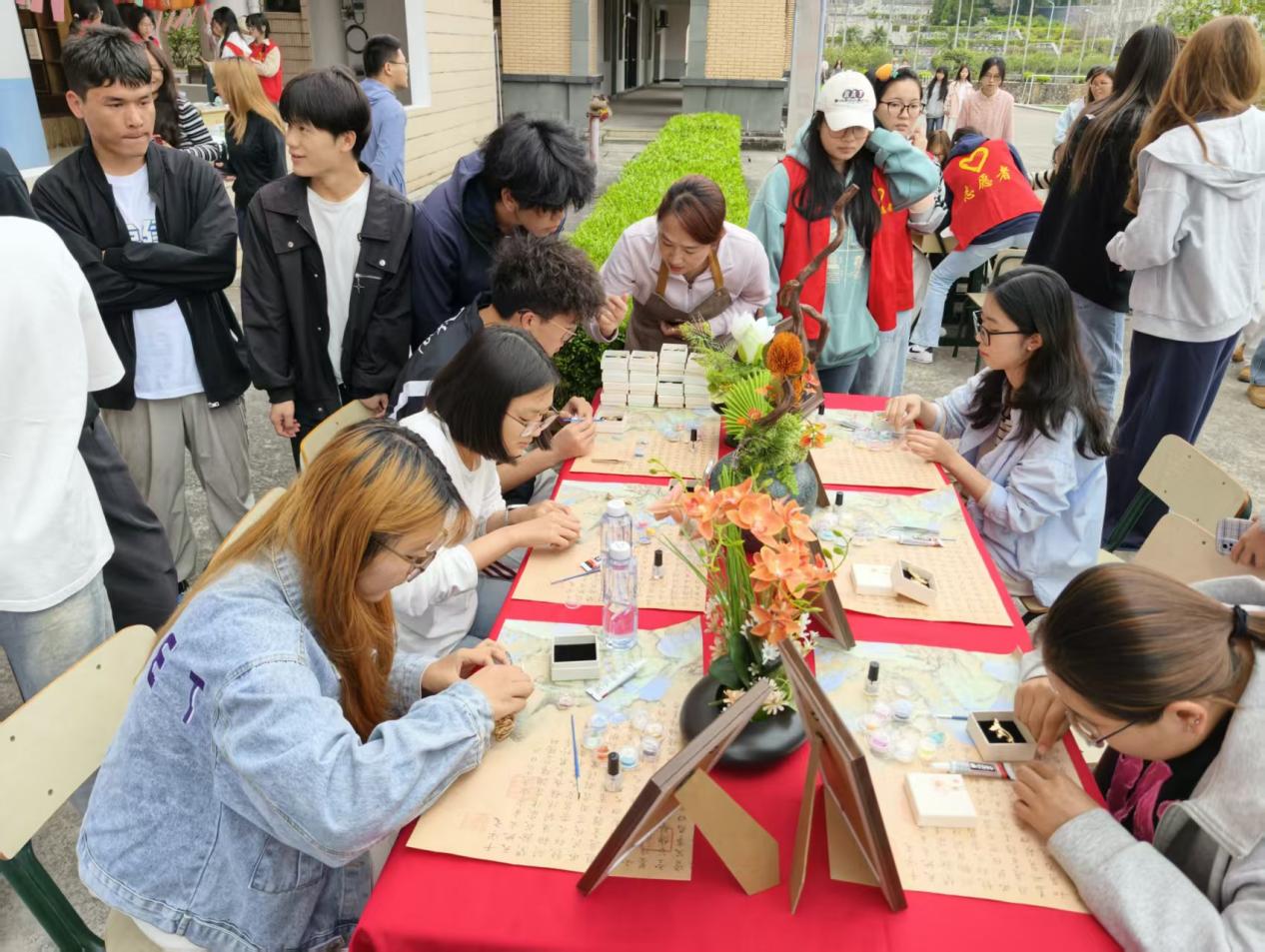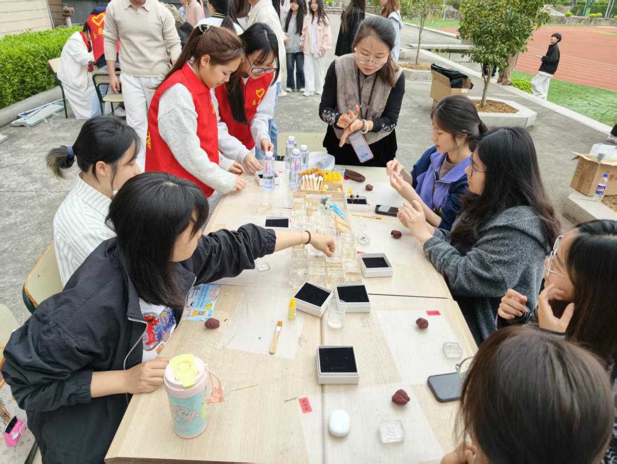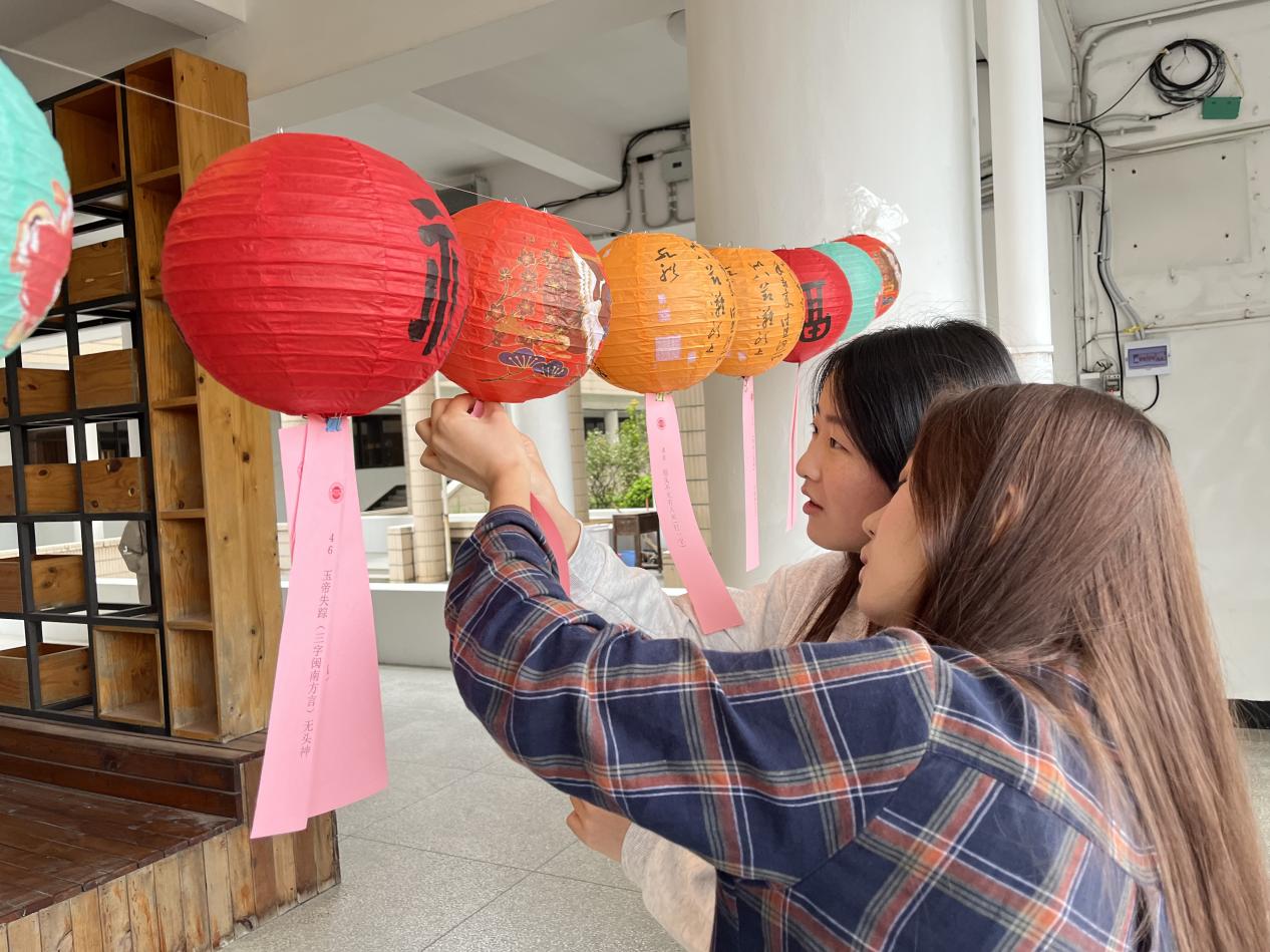 活动现场气氛热烈高涨,各类非遗技艺轮番亮相、精彩纷呈,让在场师生目不暇接。妆糕人传承人张明铁老师指尖灵动,揉捏点压间,一个个色彩鲜艳、活灵活现的人偶跃然眼前,引来阵阵惊叹;糖画传承人陈学珍老师以勺为笔、以糖为墨,在石板上挥洒自如,花鸟鱼虫等造型栩栩如生;漆扇制作区域人头攒动,大家借助水纹将天然漆料晕染出自然别致的纹理,再拓印于扇面,成就一把把独具美感的雅致漆扇;永春香牌与香片制作现场清香袅袅,在刘晓丽老师的指导下,师生们通过捣制、过筛、压模、晾干等工序,制作出一片片清雅绵长、沁人心脾的香片与香牌;螺钿胸针制作精巧细致,戴雅聪老师选取多彩贝壳,经裁切、镶嵌、打磨等工序,于方寸之间尽显流光质感与精巧匠心。在各位传承人的耐心示范与手把手指导下,师生们纷纷动手体验,沉浸式感受闽南传统技艺的独特韵味与文化魅力。闽南文化灯谜区同样人气十足,大家驻足竞猜,在趣味互动中领略闽南语言与民俗风情的独特魅力。