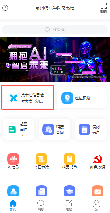 ②进入移动图书馆首页,点击“第十届信息检索大赛(初赛)”参与答题